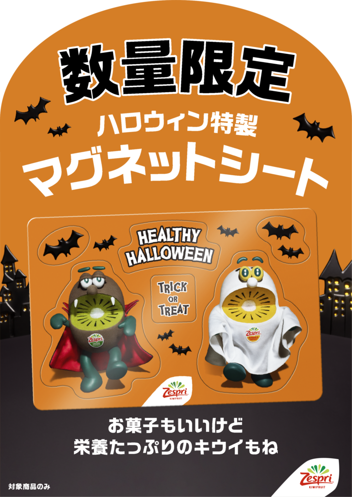 HEALTHY HALLOWEEN(ヘルシーハロウィン)をテーマとした特製マグネットシート(約100×150mm)が付いたプロモーションパックを数量限定で発売いたします。冷蔵庫など毎日目にする場所に貼って、キウイブラザーズと一緒にヘルシーハロウィン気分を盛り上げてください。